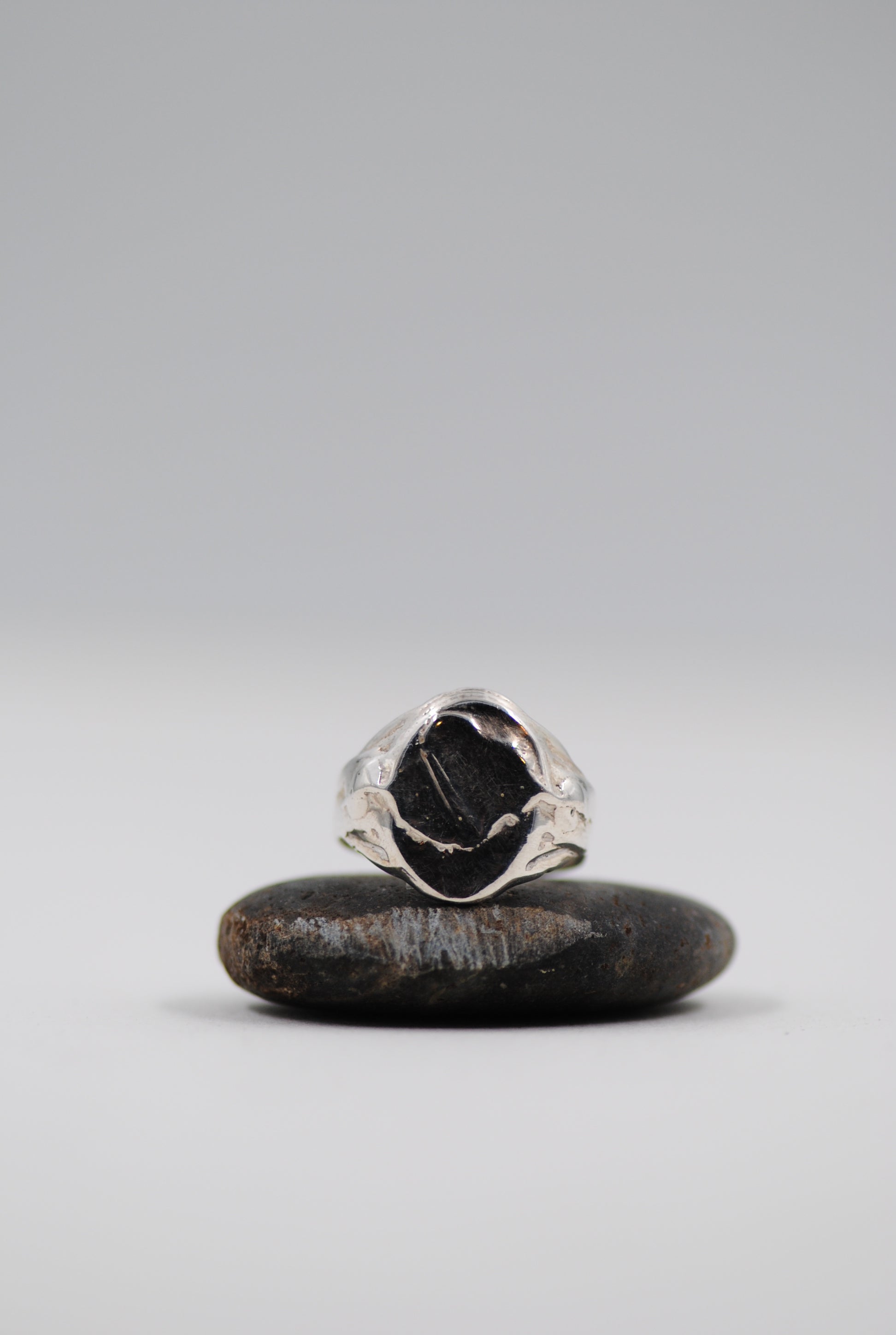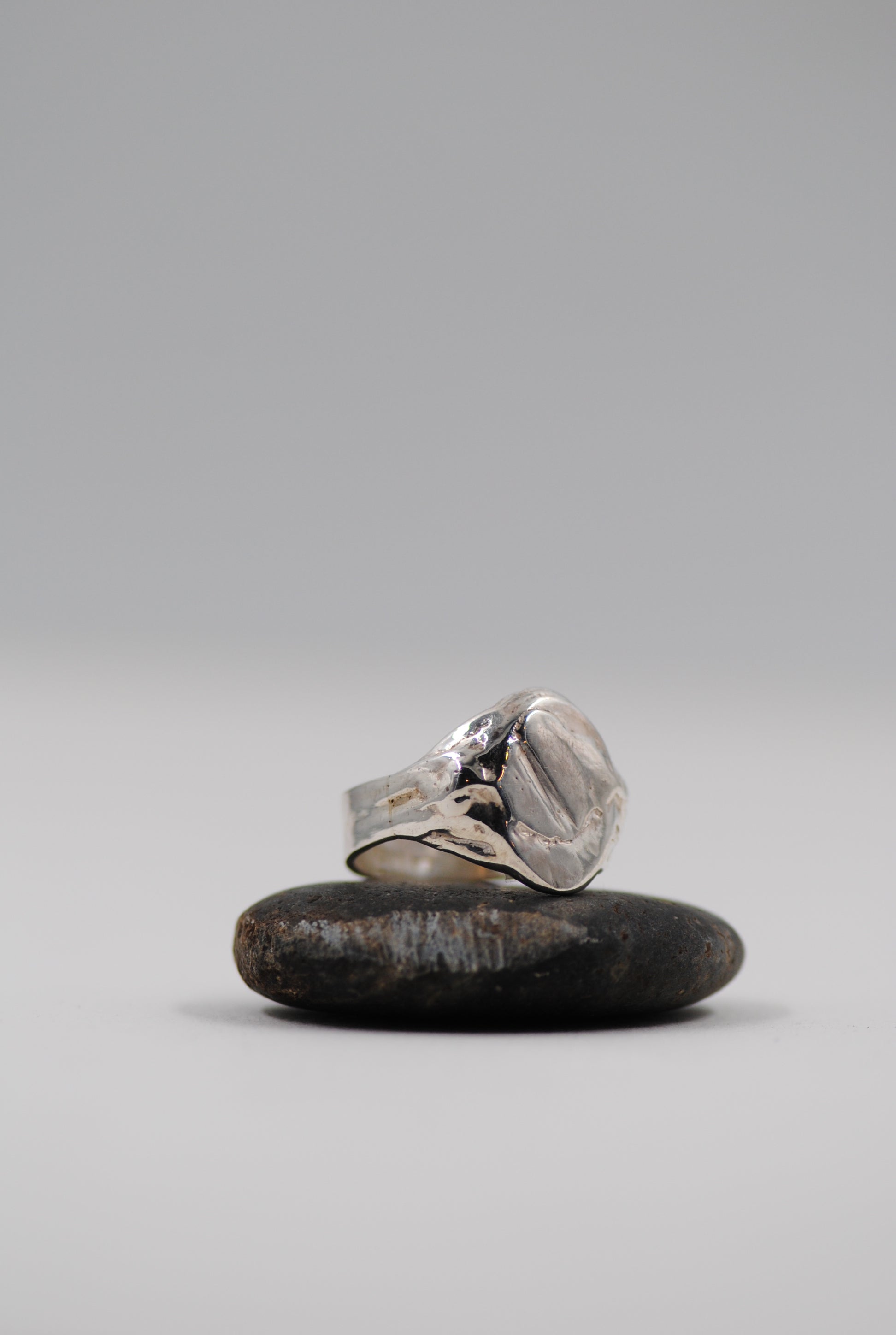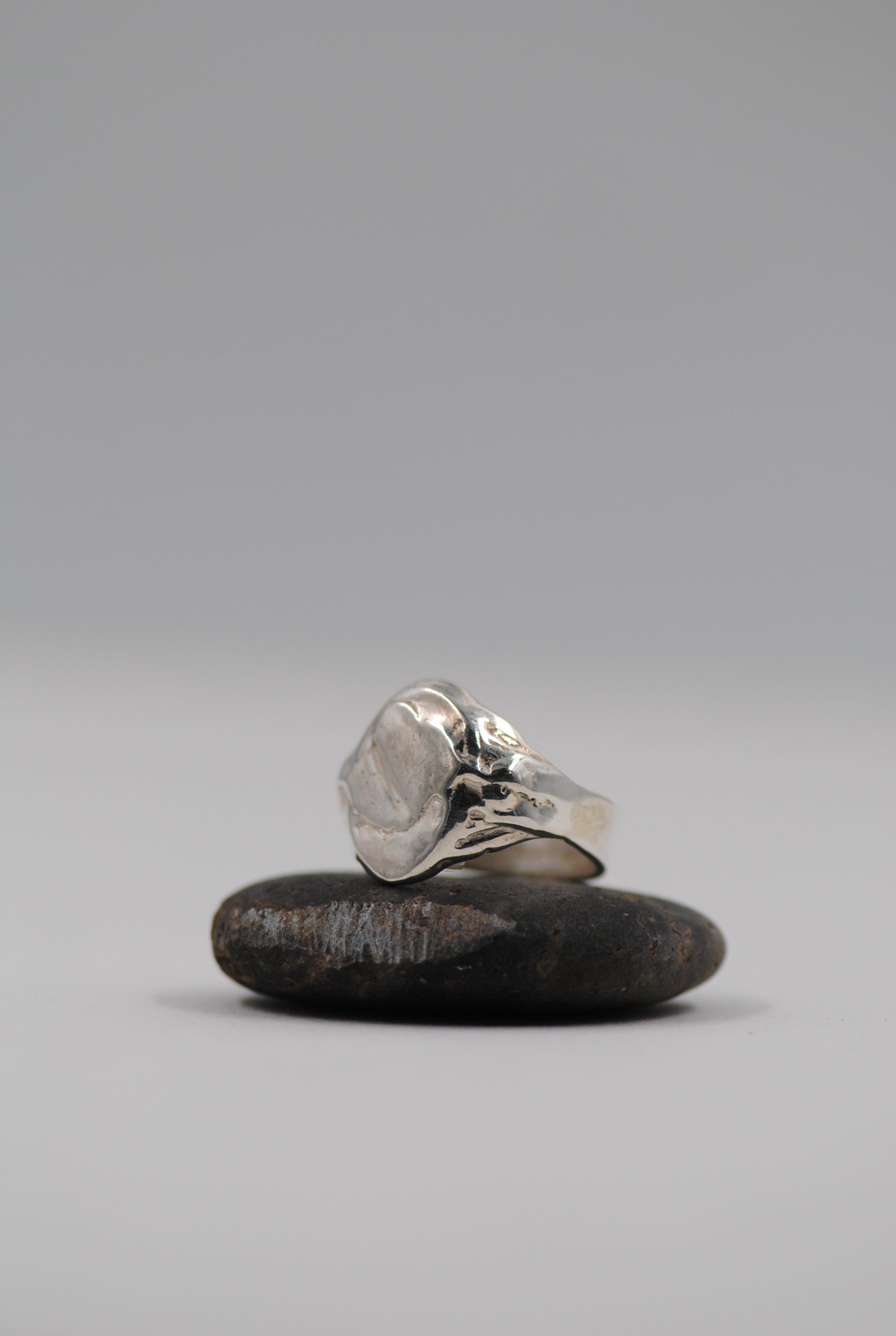 This unisex ghost ring, a one-of-a-kind creation, is born from a mold of a cherished heirloom, cast by hand using recycled sterling silver. Its subtle texture evokes the essence of wabi-sabi—imperfect, organic, and beautifully worn, like the soft echo of a faded memory. Each curve and surface whispers of time's gentle passage, offering a piece that is both unique and timeless. Currently sized at 8.5, it carries the spirit of craftsmanship and the quiet elegance of nature’s delicate flaws.