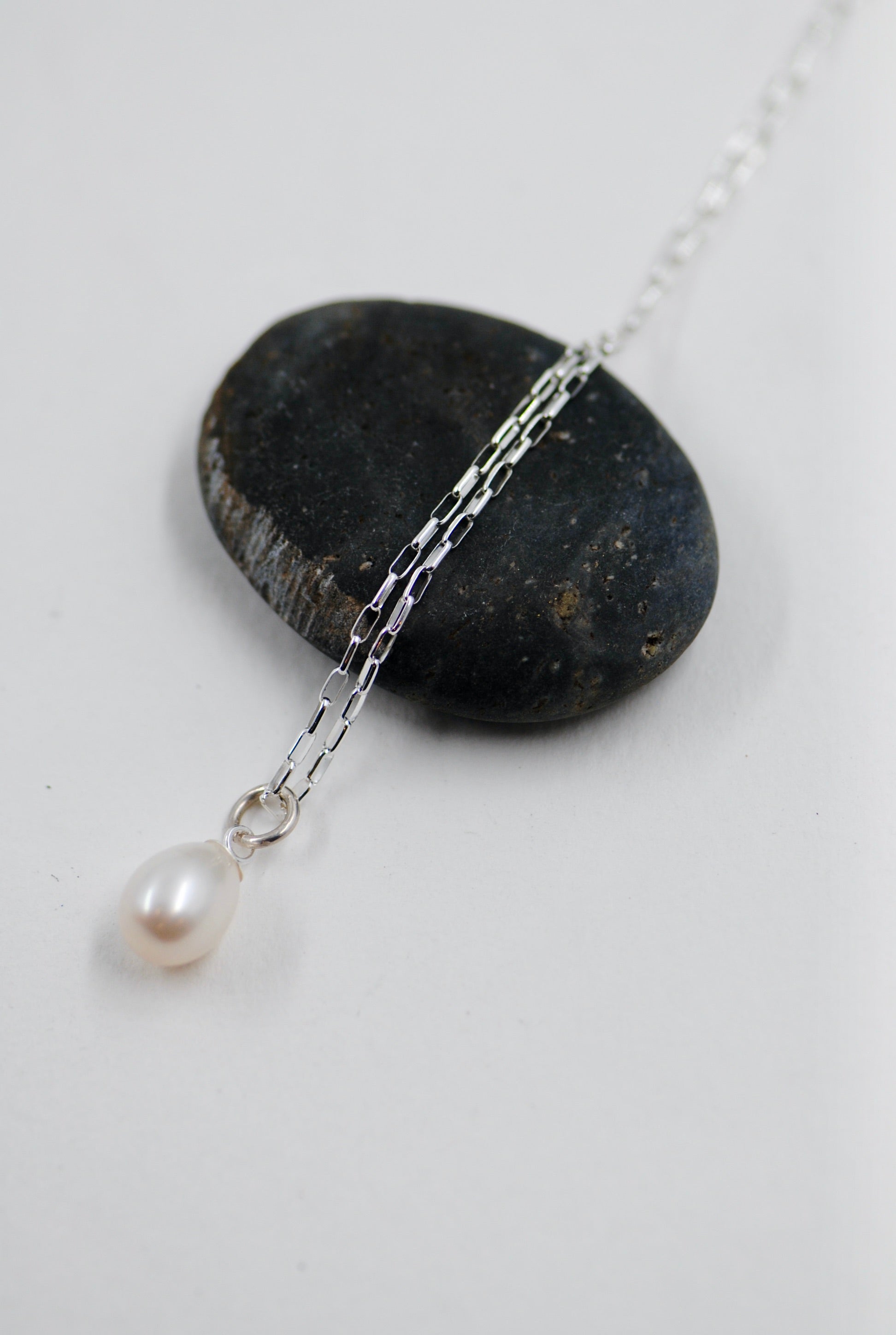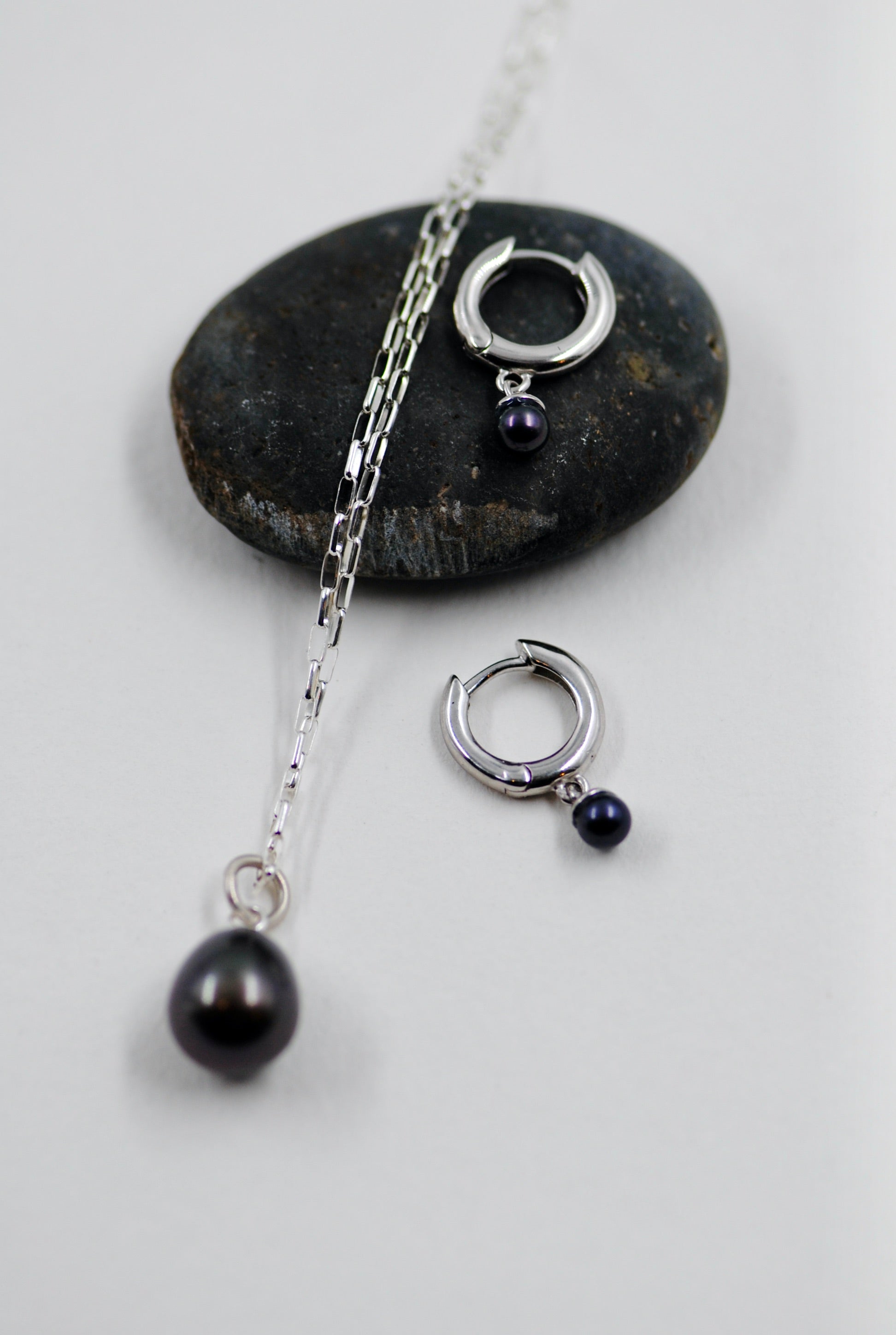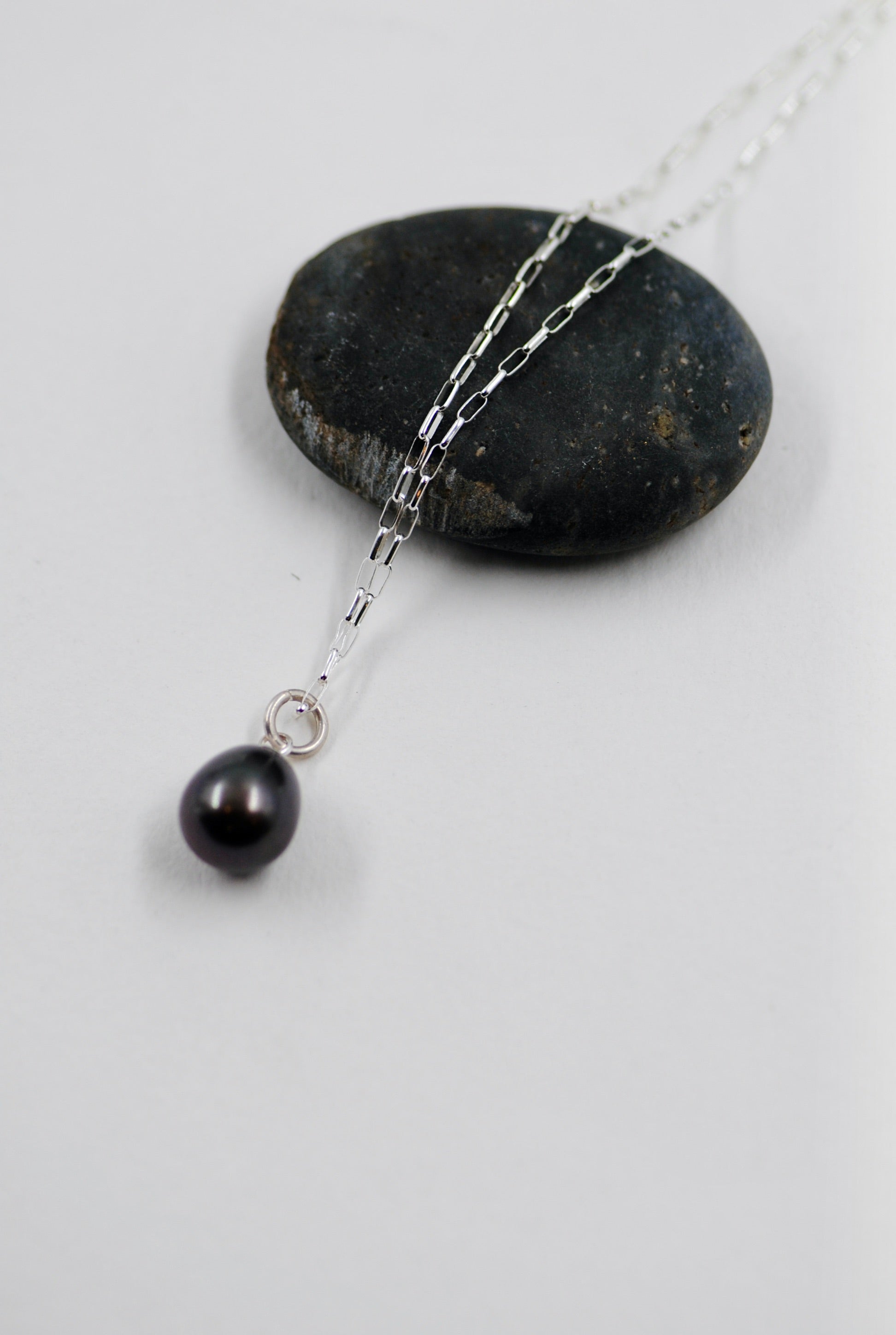 A single raven’s wing or cultured freshwater pearl drop on an 18-inch paperclip chain, forged from recycled sterling silver—an elegant whisper of nature’s contrast, where shadow meets shimmer in a delicate dance of sustainability and grace.