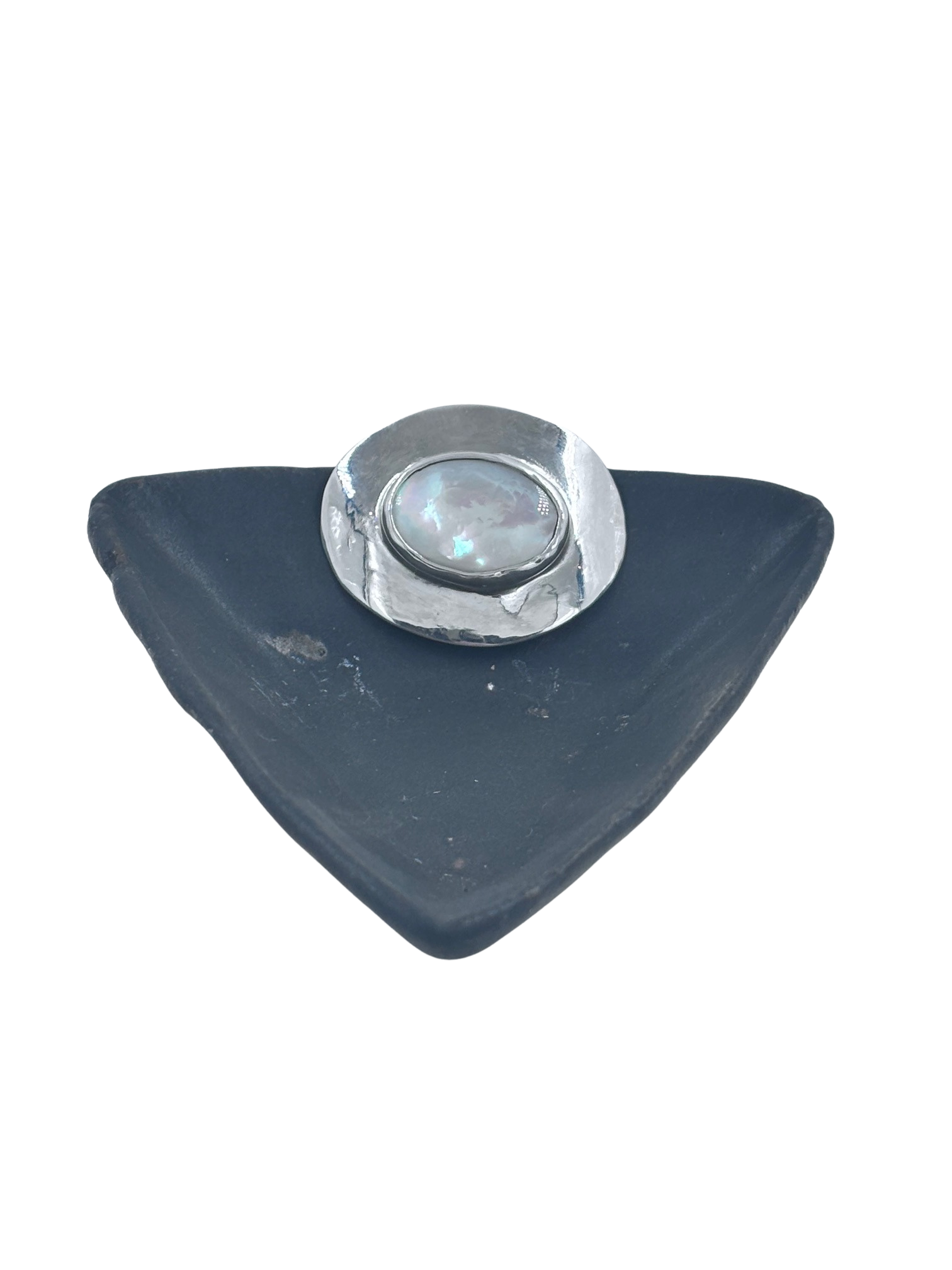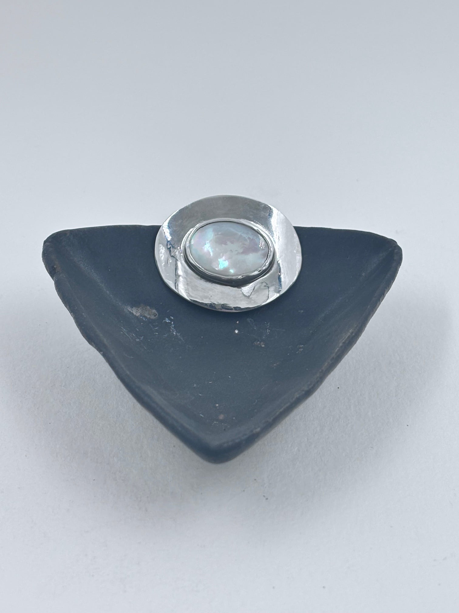 A luminous mother-of-pearl cabochon set within a sleek sterling silver oval, designed to be worn by threading through an elastic band. This versatile piece catches the light with every movement, offering a soft iridescence and effortless adaptability.