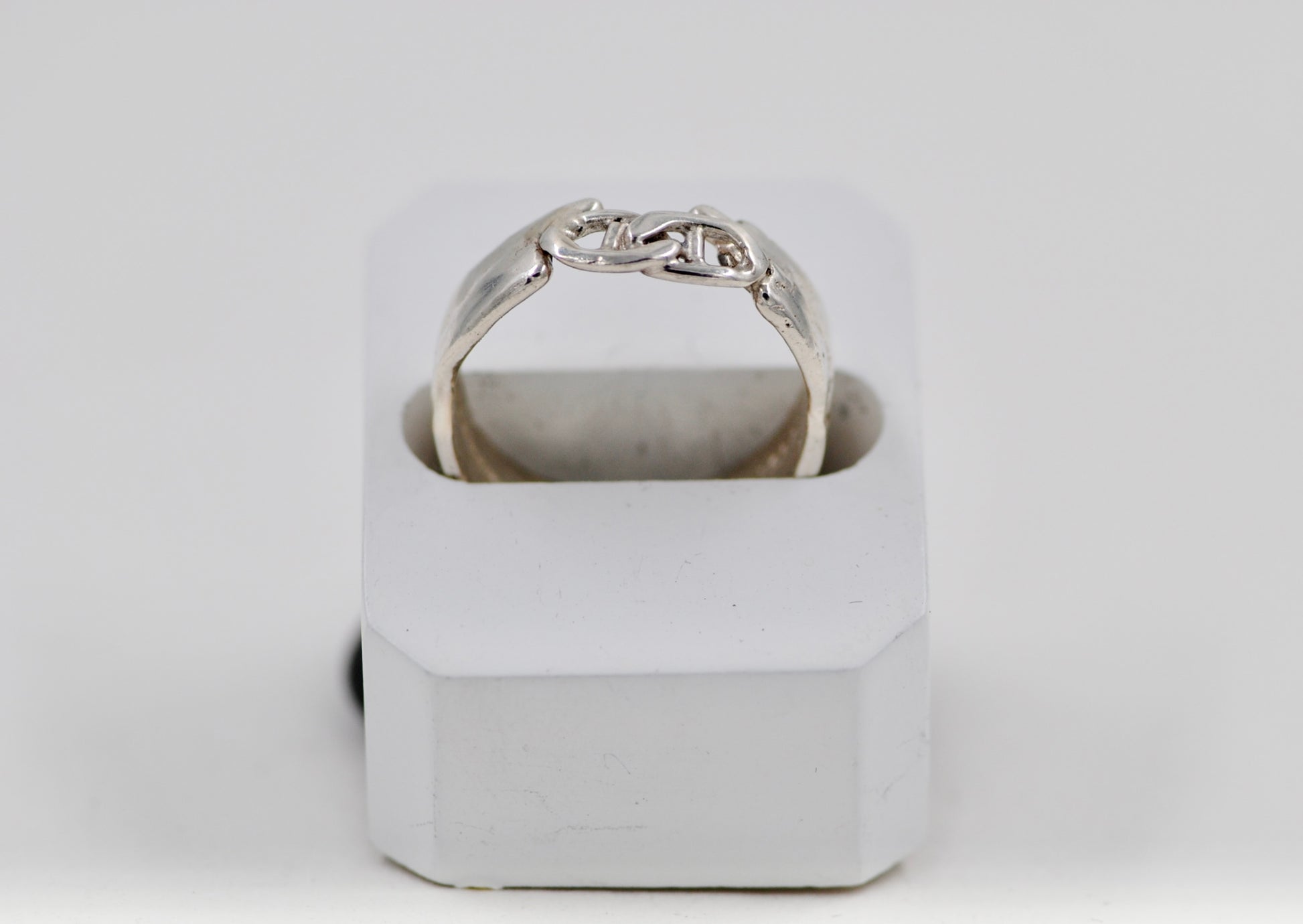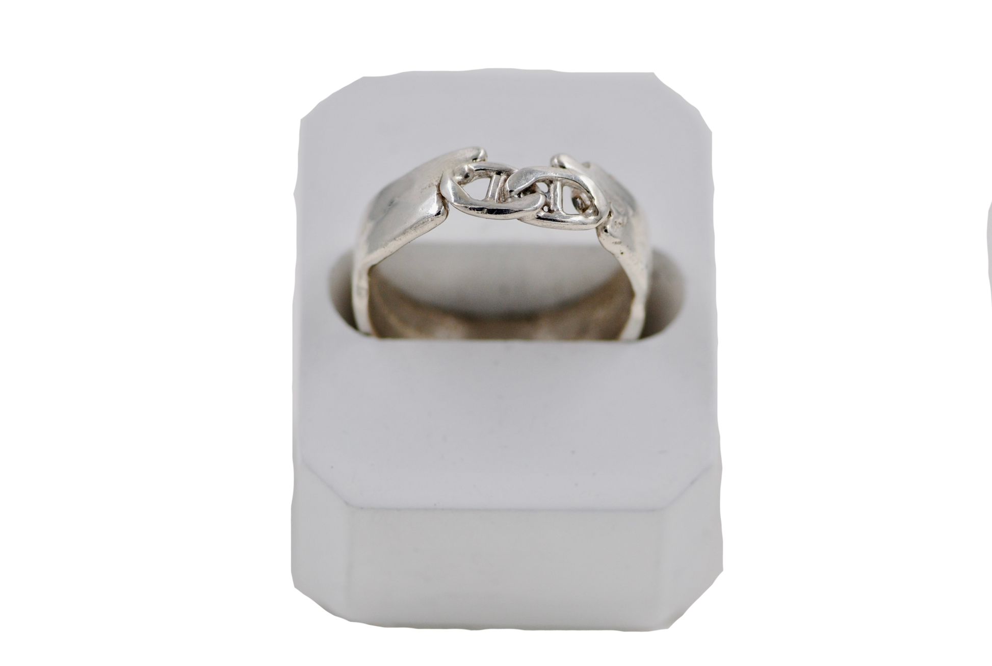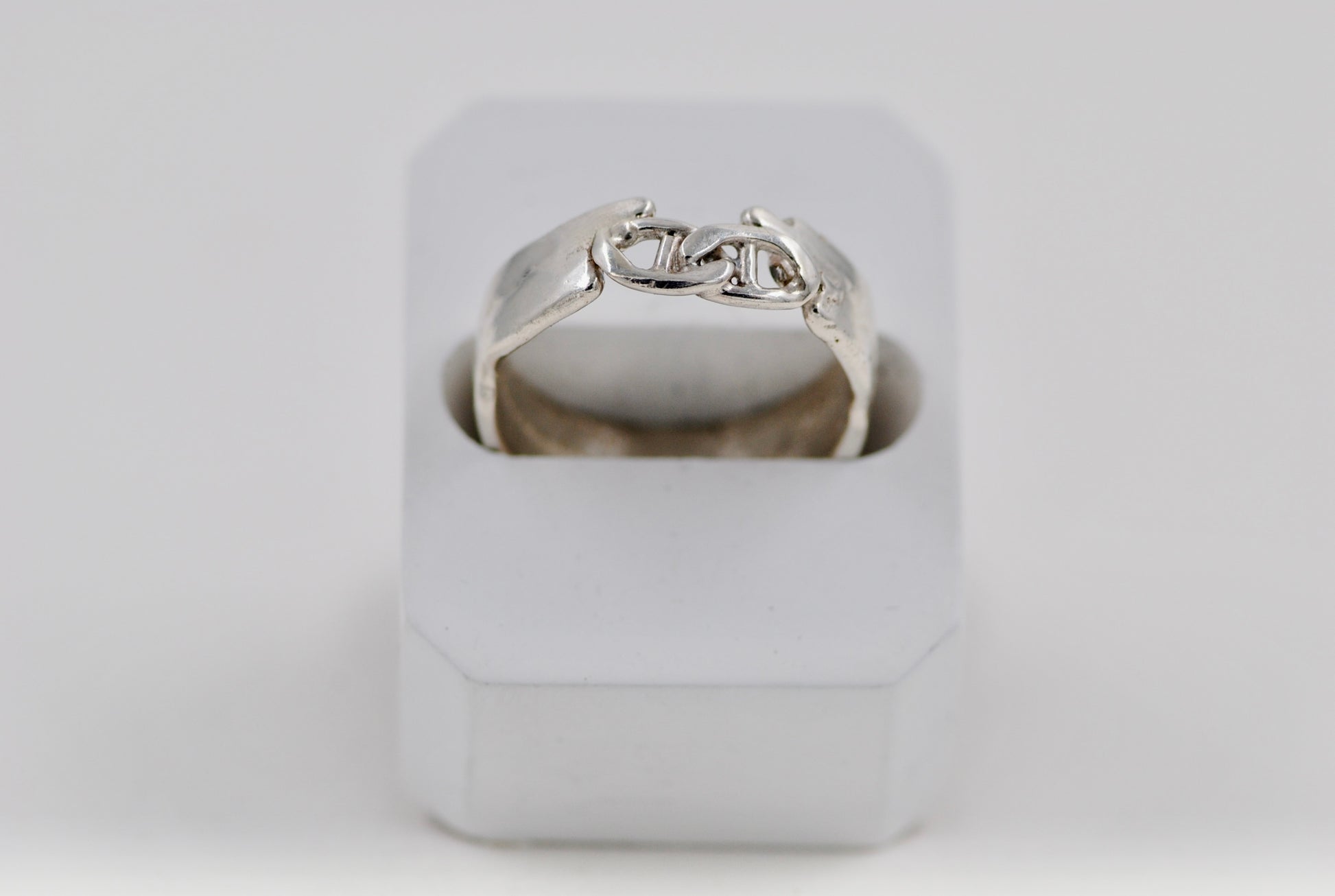 Size 8.5 sand-cast wedding band crafted in recycled sterling silver. This ring features an organic, hand-formed texture created through the sand-casting process and incorporates an upcycled mariner chain, carefully soldered into the design. By transforming a broken mariner chain into a wedding-band style ring, the piece honors the history of the original material while giving it new life as a symbolic, enduring keepsake.
