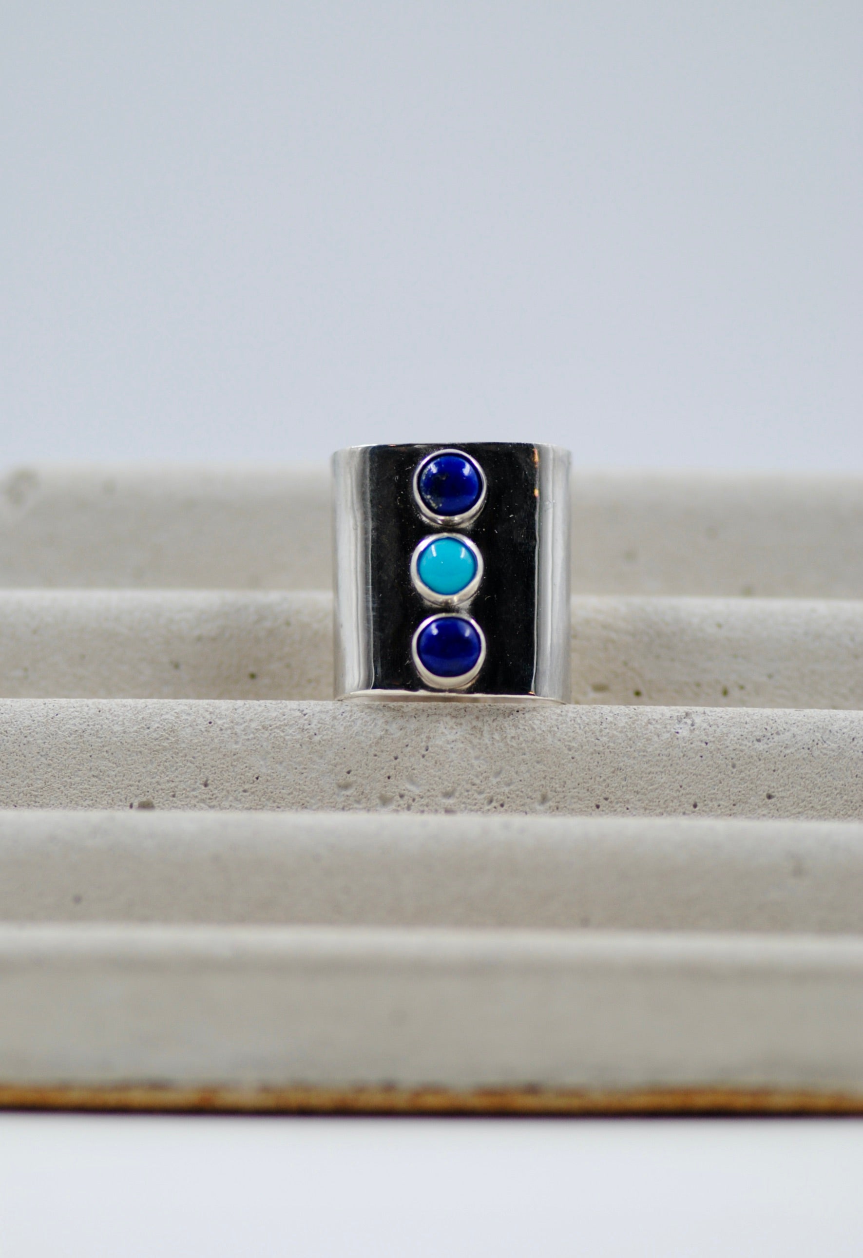 This captivating scarf slide, crafted from recycled sterling silver, is adorned with the vibrant hues of turquoise and lapis. Perfect for bandana-sized scarves or those of smaller proportions, it measures .5 inches in length, .75 inches in height, and .25 inches in width, offering a refined touch to any ensemble.
